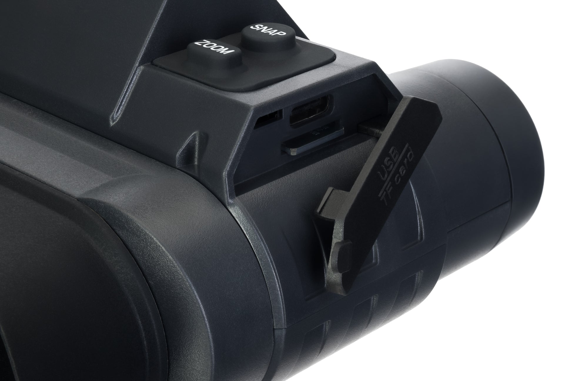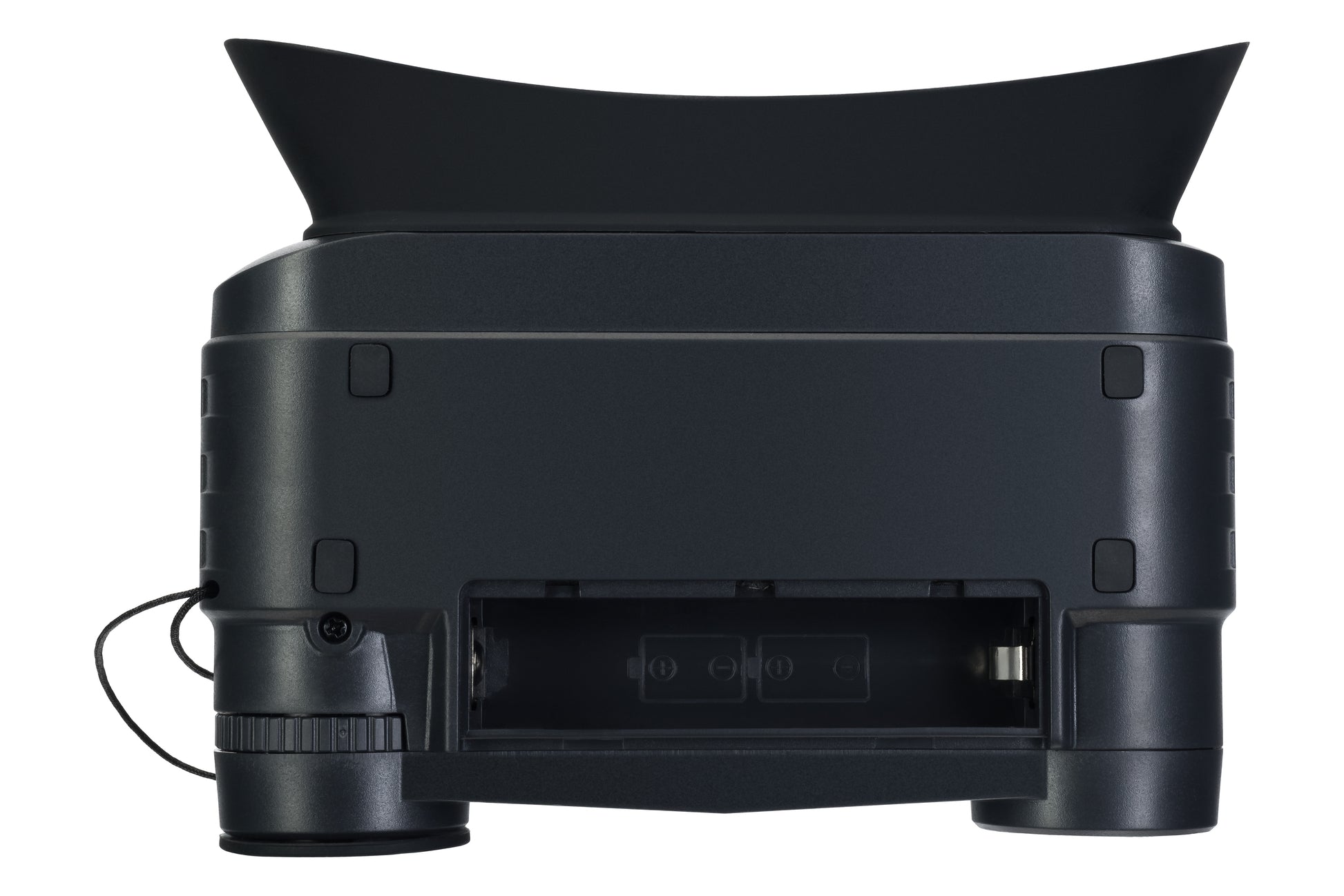 Obudowa wykonana jest z tworzywa sztucznego ABS i chroni urządzenie przed pyłem i wodą. Dwa akumulatory litowo-jonowe o pojemności 700 mAh każdy zapewniają nieprzerwaną pracę lornetki przez 2 godziny z włączonym podświetleniem IR i do 6 godzin z wyłączonym. Funkcja automatycznego wyłączania jeszcze bardziej zmniejsza zużycie energii.